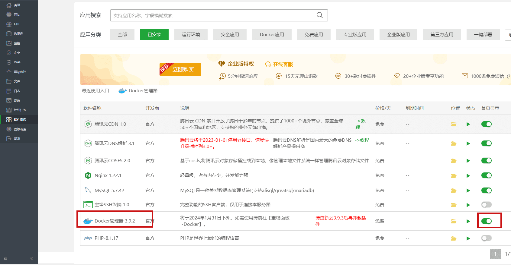 可以把Docker管理器放到首页方便管理,用SSH远程连接服务器查看docker和docker-compose版本