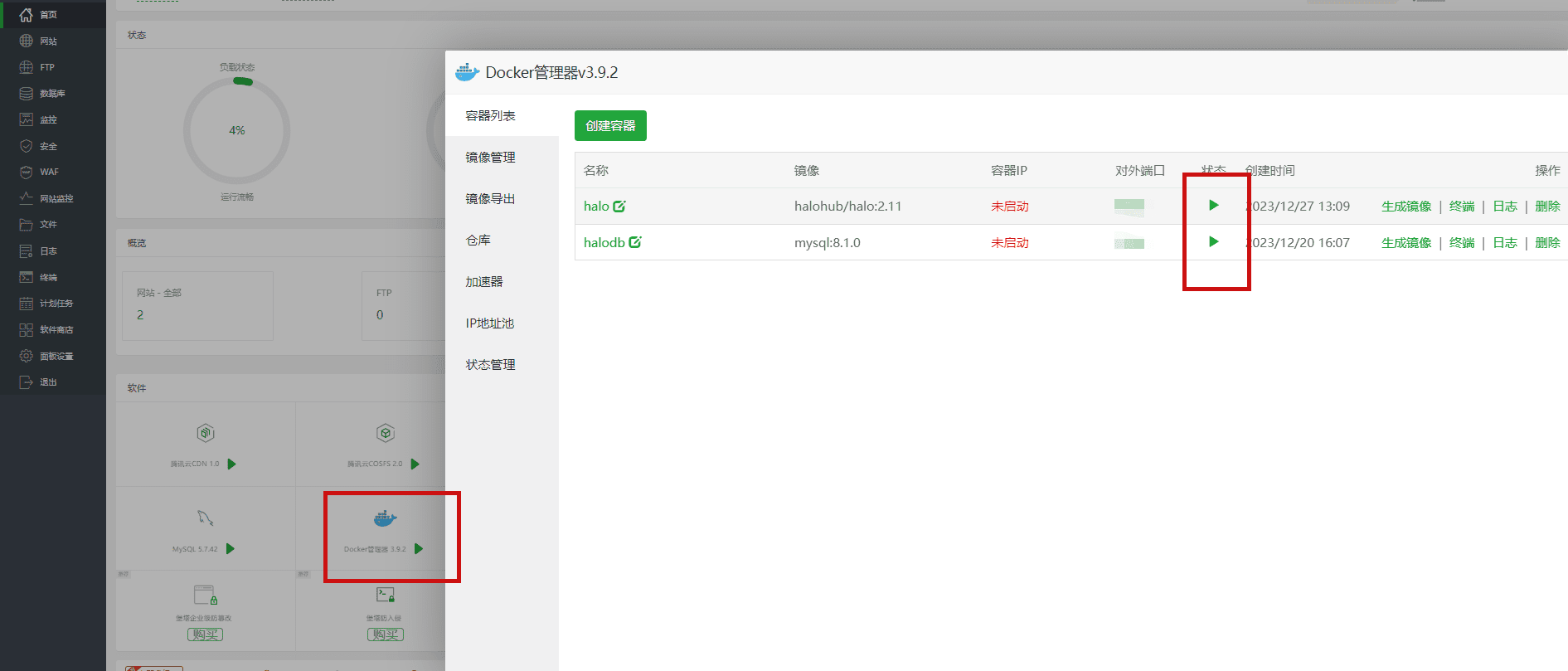 可以去宝塔首页查看容器有无启动,有无对外端口