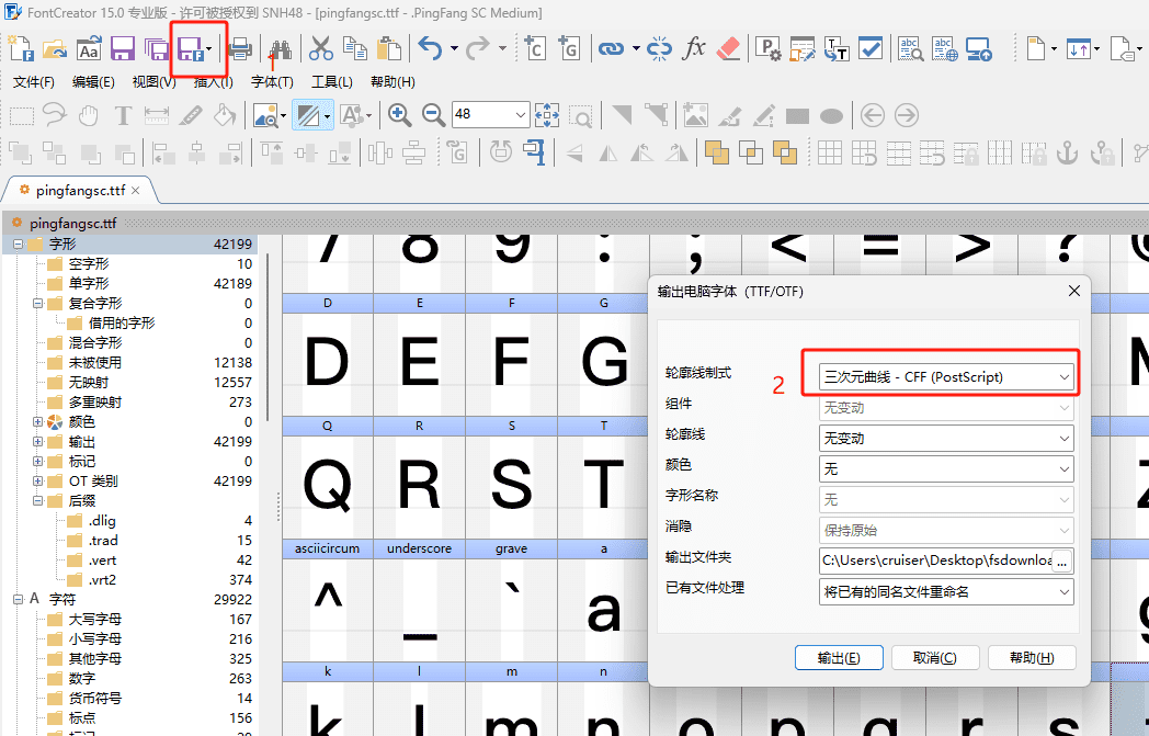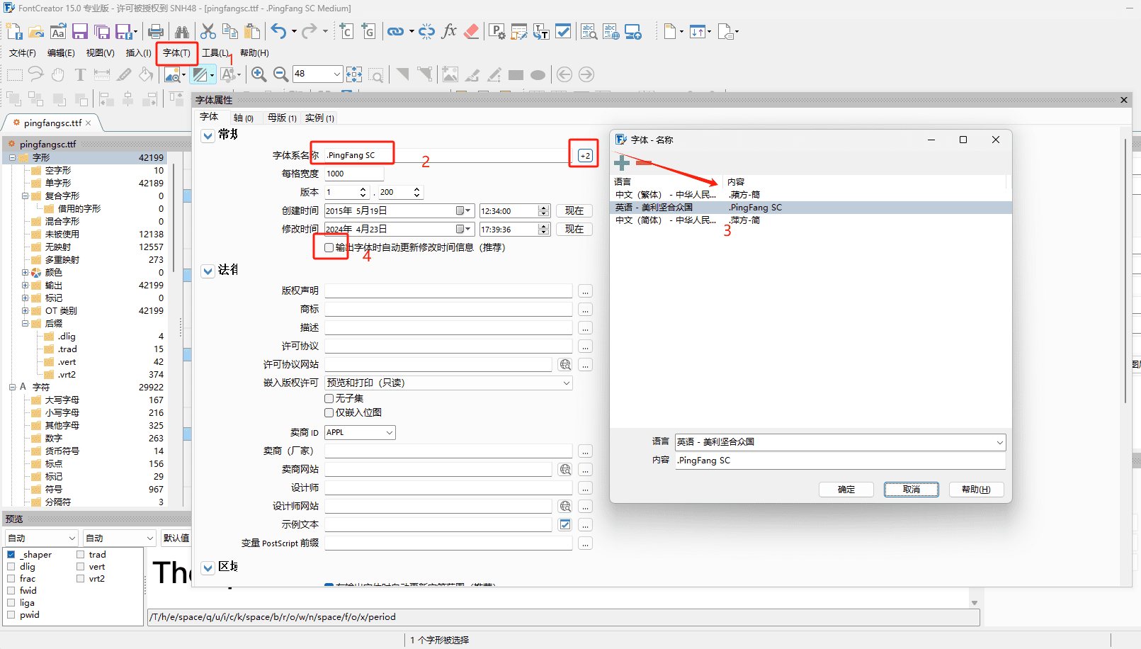使用FontCreator工具下载,并将自己的.ttf格式的字体导入进去,具体需要操作两个地方
