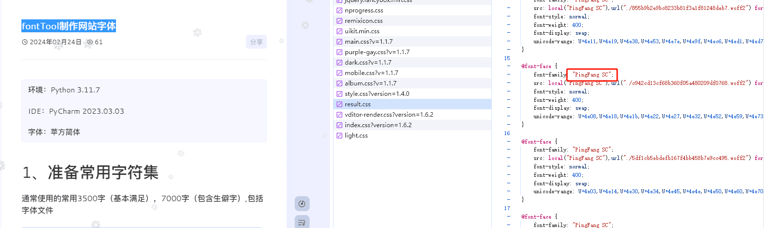 1)一般来说字体太大需要先抽出常用的3500字符或者7000字符的子集,本文不赘述,具体实现请查阅:fontTool制作网站字体