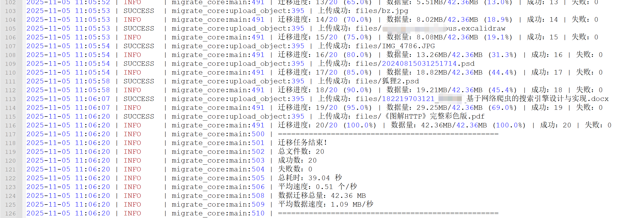 通过控制台输出或logs目录下的日志文件查看迁移详情