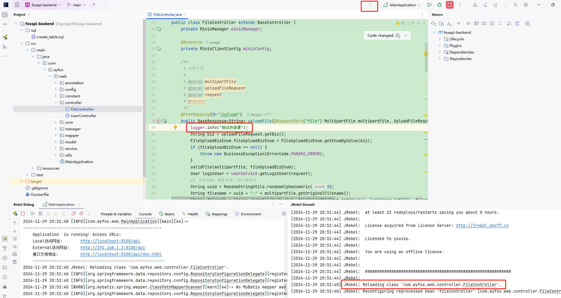 启动项目,可以看到热部署生效,如果是多模块可以在左侧热部署图标勾选即可