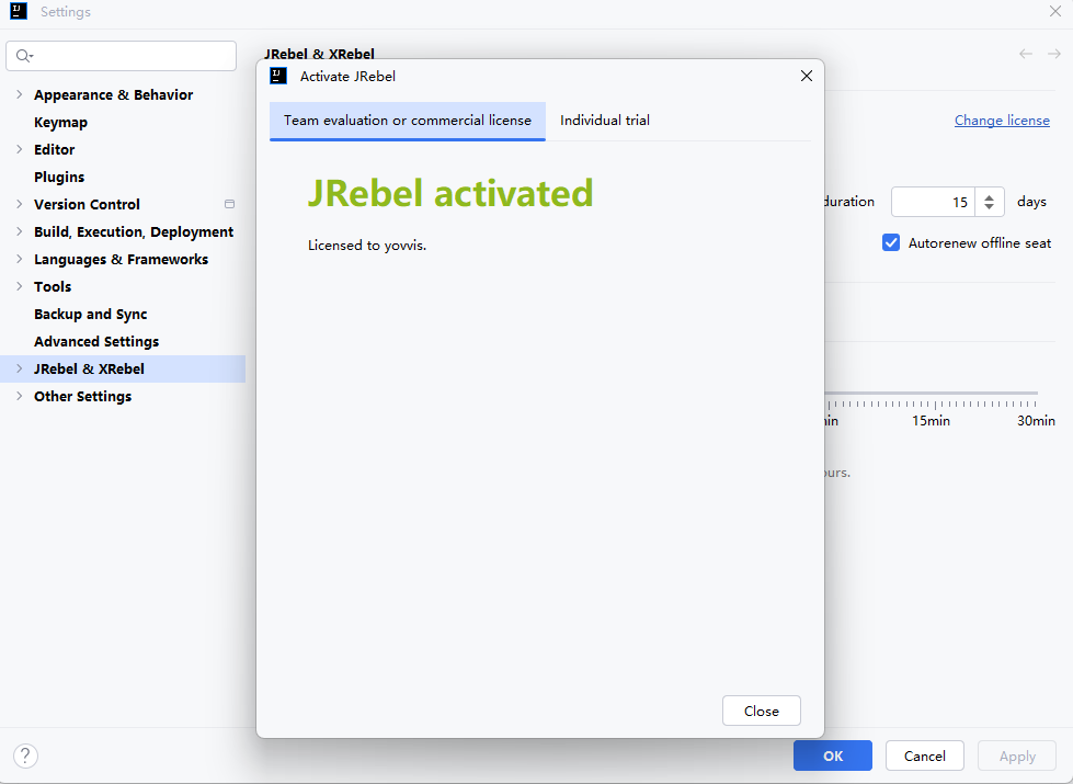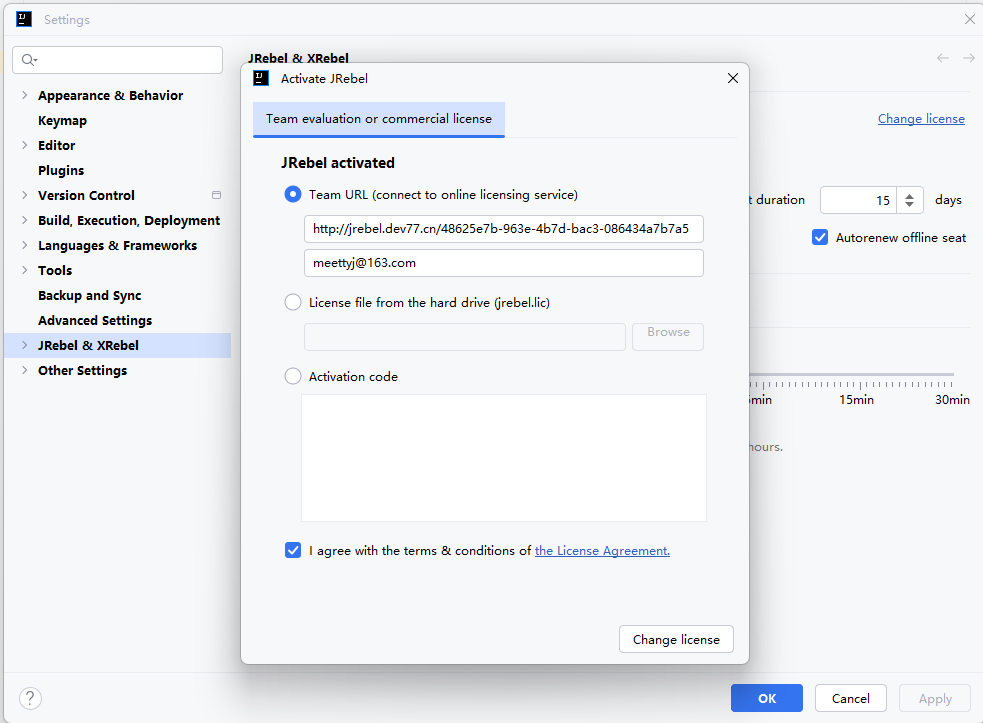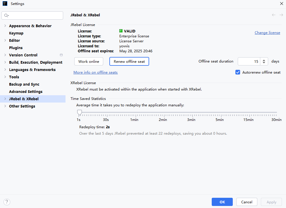 激活成功之后可以设置离线使用,个人喜欢时间30s,小锤子手动编译,同事最好去关闭hotswap。